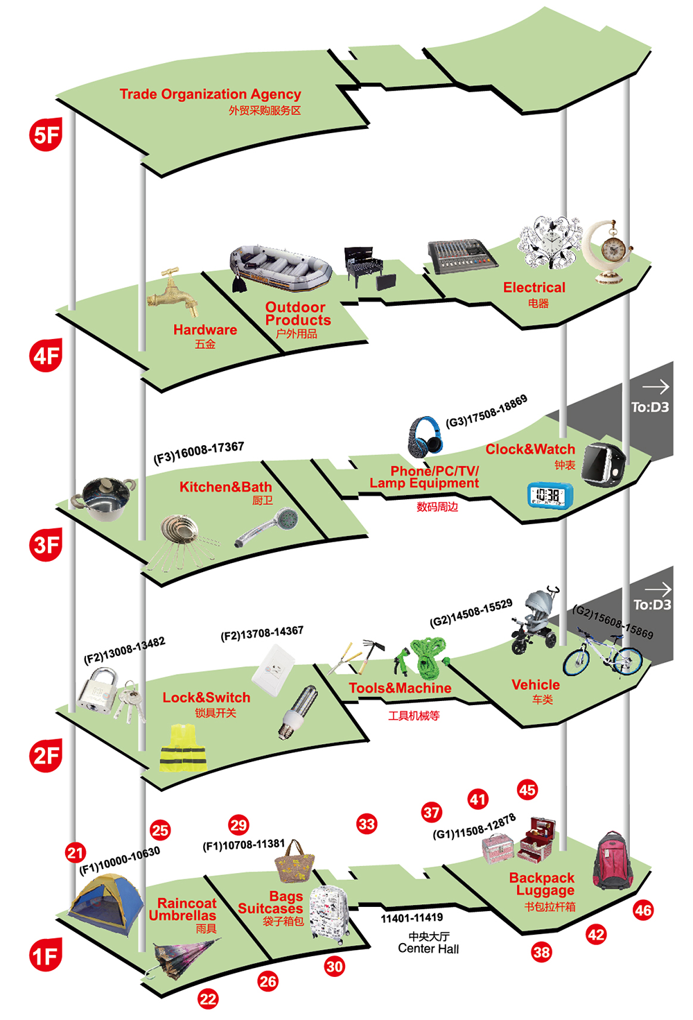 3F: Equipo de telecomunicaciones, Instrumentos electrónicos – Equipo fotográfico, Ferretería de cocina y baño, Electrodomésticos, Relojes, Ferretería y aparatos eléctricos(Distrito 2 Este)