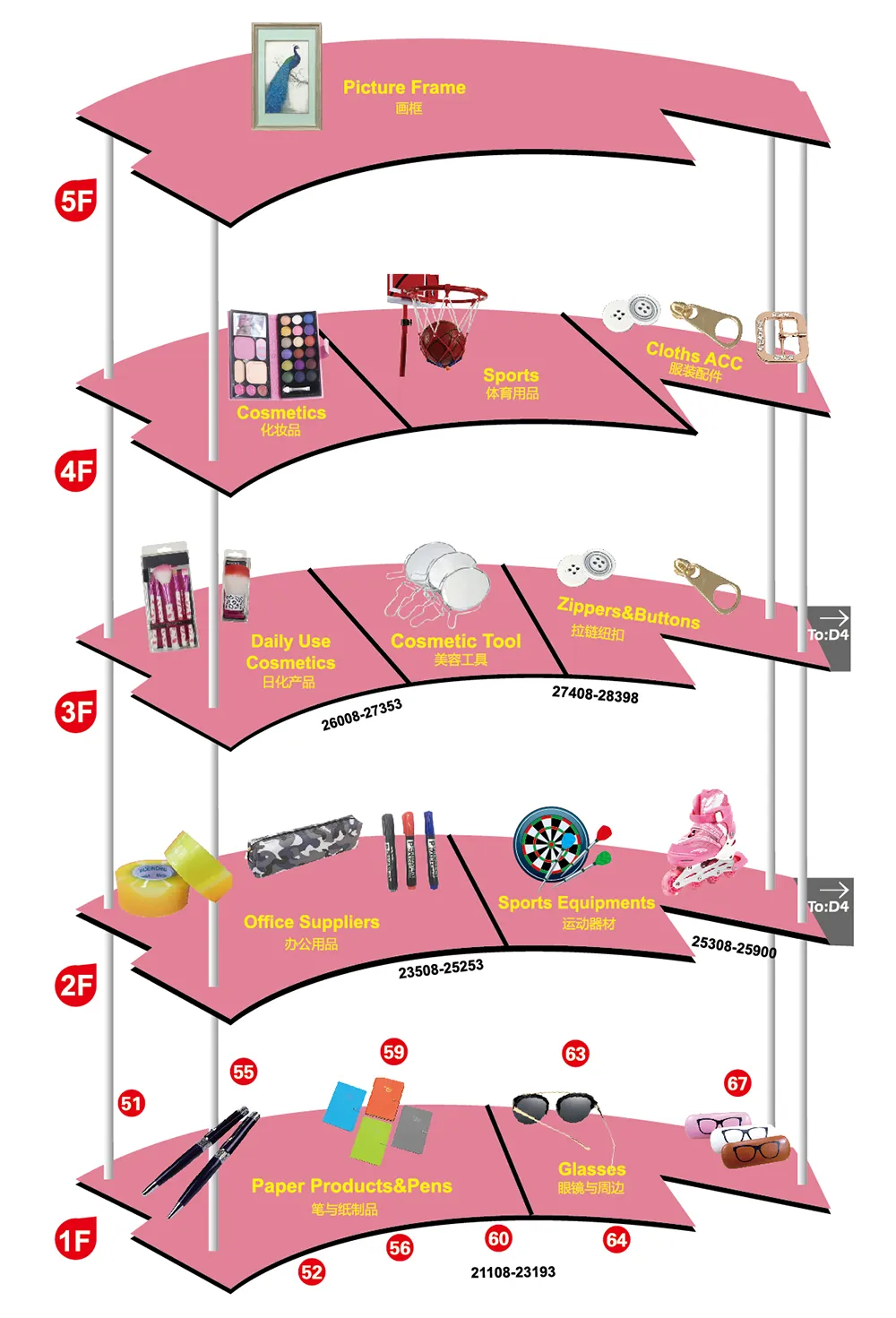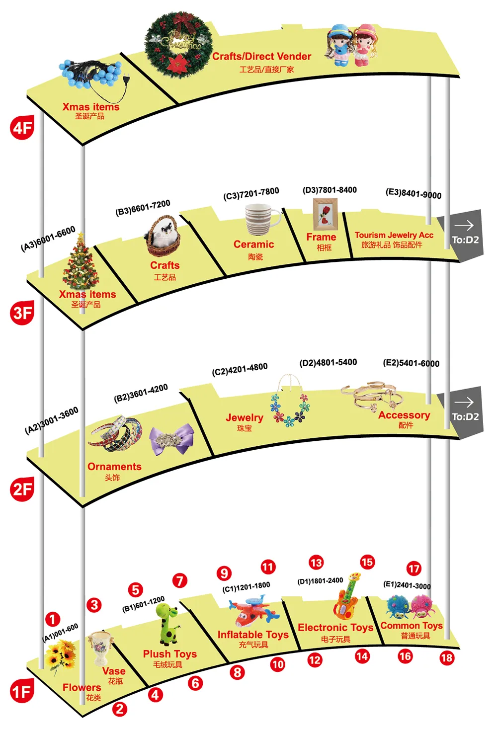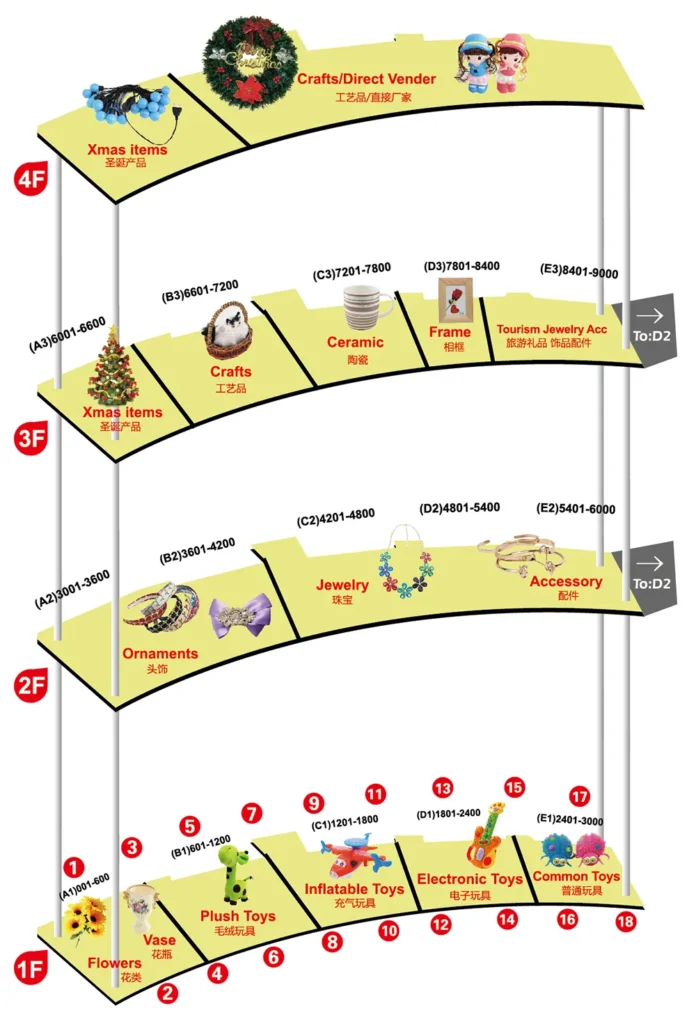 1F: Juguetes Hinchables, Juguetes Motorizados, Sala Este (Juguetes/Joyería), Flores Artificiales, Accesorios para Flores, Juguetes de Peluche, Juguetes en General, Accesorios de Joyería (Expansión Este)