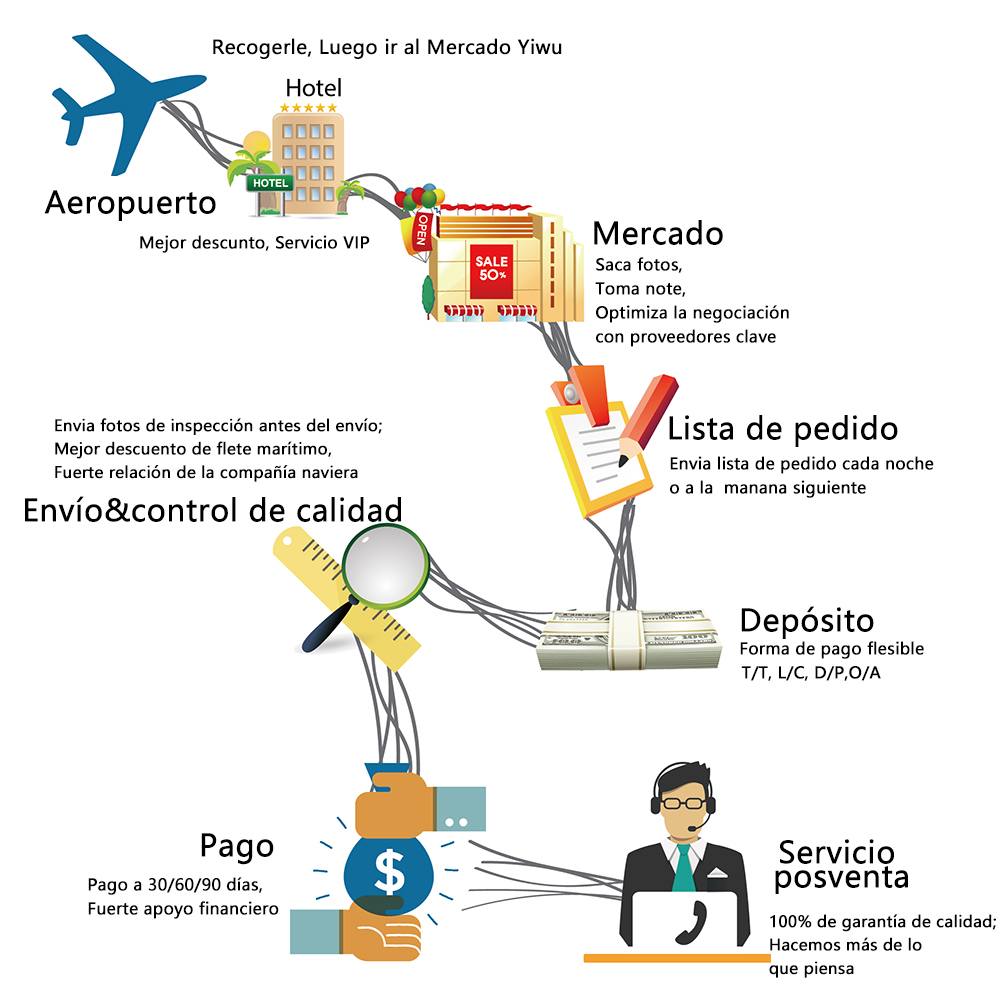Contamos con personal de servicio dedicado a llevarle al mercado de Yiwu para que pueda familiarizarse rápidamente con el entorno del mercado y ver más muestras en el mercado. Además, también ofrecemos servicios de recogida y alojamiento.